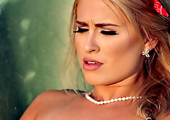 Blonde in lingerie & glasses masturbates in the garden while wearing thongs