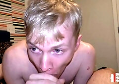 Skinny twunk worships daddy's fat cock with a rough deepthroat session till he swallows every drop