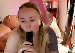 Large bazookas skinny golden-haired sweetheart slips a sex tool and her fingers in her juicy vagina