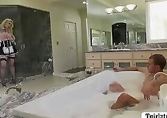 Babysitter TS Ariel Demure is jerking off in the baths and her boss caught her.After that,incident her boss get sexually excited and this guy then rip