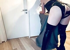 Standing in her dungeon wearing a sexy ebony latex corset with matching latex haunch-highs, Chelsea Marie is already in full swing, drubbing the back