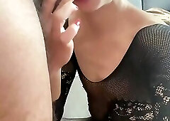 Busty ladyboy in lace lingerie strokes her huge dick till cumshot on her belly